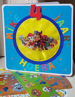 Vandaag is Mike 4 jaar geworden en had ik deze kaart voor hem gemaakt. Druk je op de gele sticker gaan er rode, gele en blauwe lampjes knipperen. Als extraatje nog wat stickervellen van de Action bijgevoegd.