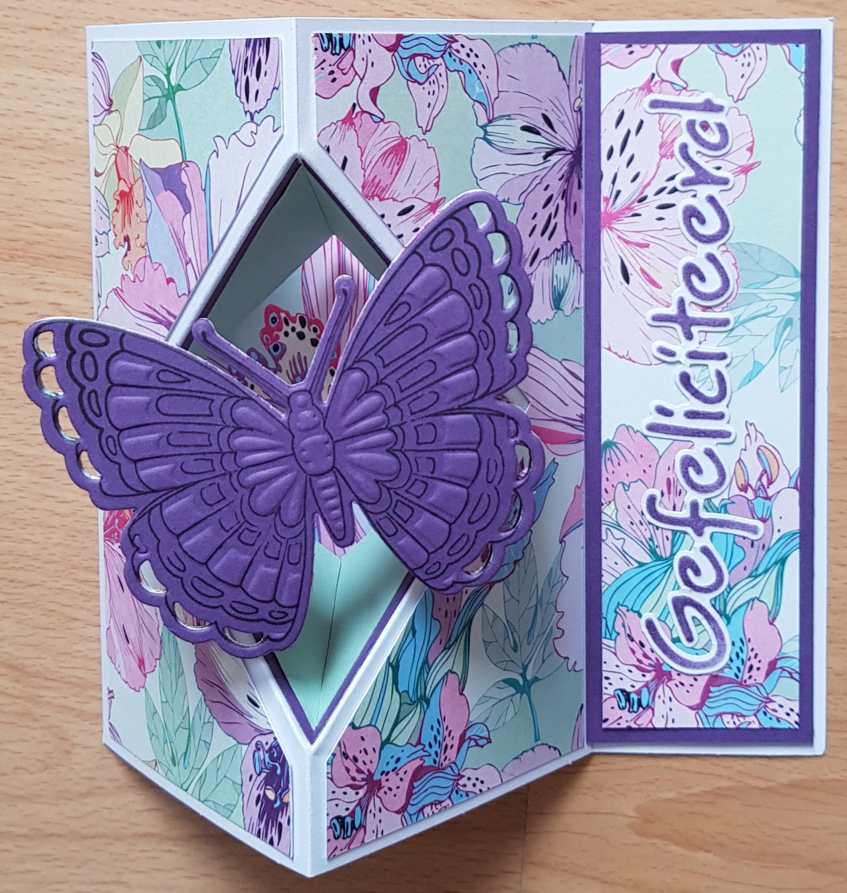 Deze kaart heb ik eerder gemaakt bij een workshop die Hetty gaf. Nu gemaakt met ander papier en met een stempel en vlinder stans (zie foto) van Marianne Design. De gestanste tekst gefeliciteerd is ook van MD. Op de vlinder nog een extra paarse vlinder geplakt, dan krijg je meteen een ander effect. Met deze kaart doe ik mee met de challenge van https://knutselsenkadootjes.blogspot.com.