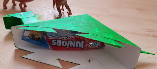 Twee dinosaurussen van doosjes gemaakt, uit het boek "51 Dingen om te maken met kartonnen dozen". In het lijf past precies een zakje lego. Voor de foto nog 2 plastic dino's erbij gezet. Deze dino's heb ik eerder gemaakt, zie 4 decemer 2018 en daar staat ook de beschrijving.
